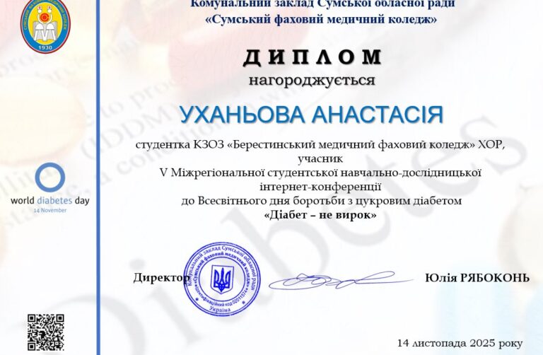 Листопад місяць виявився досить насиченим на різнопланові заходи . Викладачі та студенти наполегливо працюють і навчаються, щоб іти в ногу з часом та долати виклики, які підкидає нам життя.Docendo discimus !І ще про одну таку роботу….Так, наш заклад освіти, долучився до участі у 5-й Студентській навчально-дослідницькій інтернет- конференції до Всесвітнього дня боротьби з захворюванням на … Читати далі Участь у 5-й Студентській навчально-дослідницькій інтернет-конференції до Всесвітнього дня боротьби з захворюванням на цукровий діабет “Діабет – не вирок”